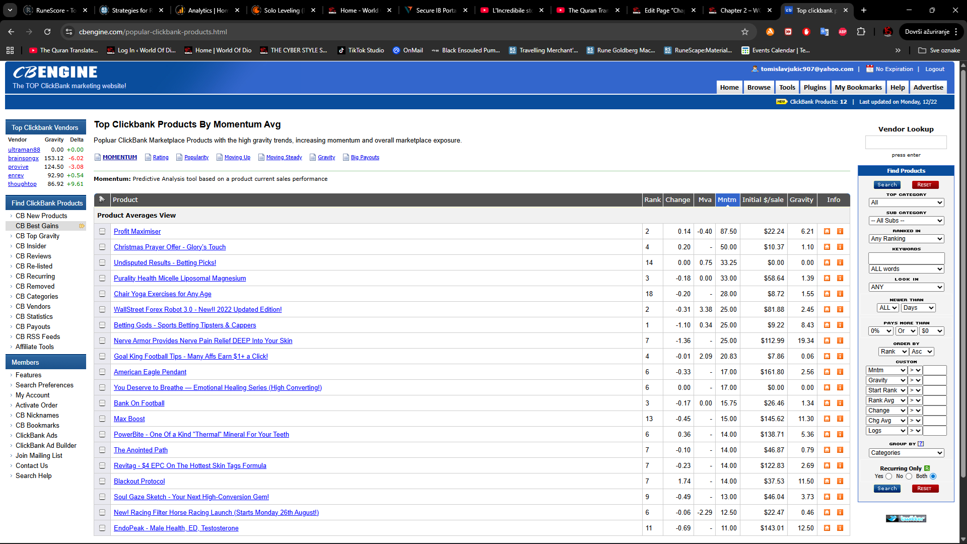 The products are listed in categories which are further broken down into sub-categories, to enable you to find products relevant to your niche. In addition, CB provides a few stats to help you choose a product:
